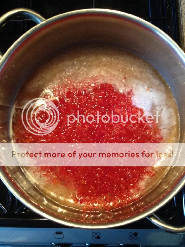 5. When dissolved, pop in the chilli and peppers and bring to a 'rollicking' boil. (Nige's words not mine)..